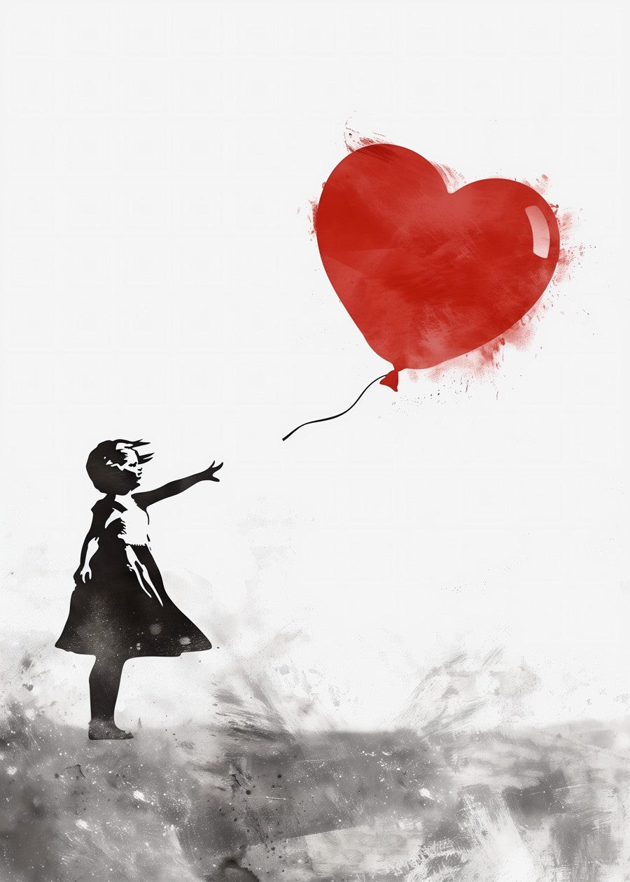 A girl reaches for a drifting red heart balloon in this powerful Banksy-style street art.