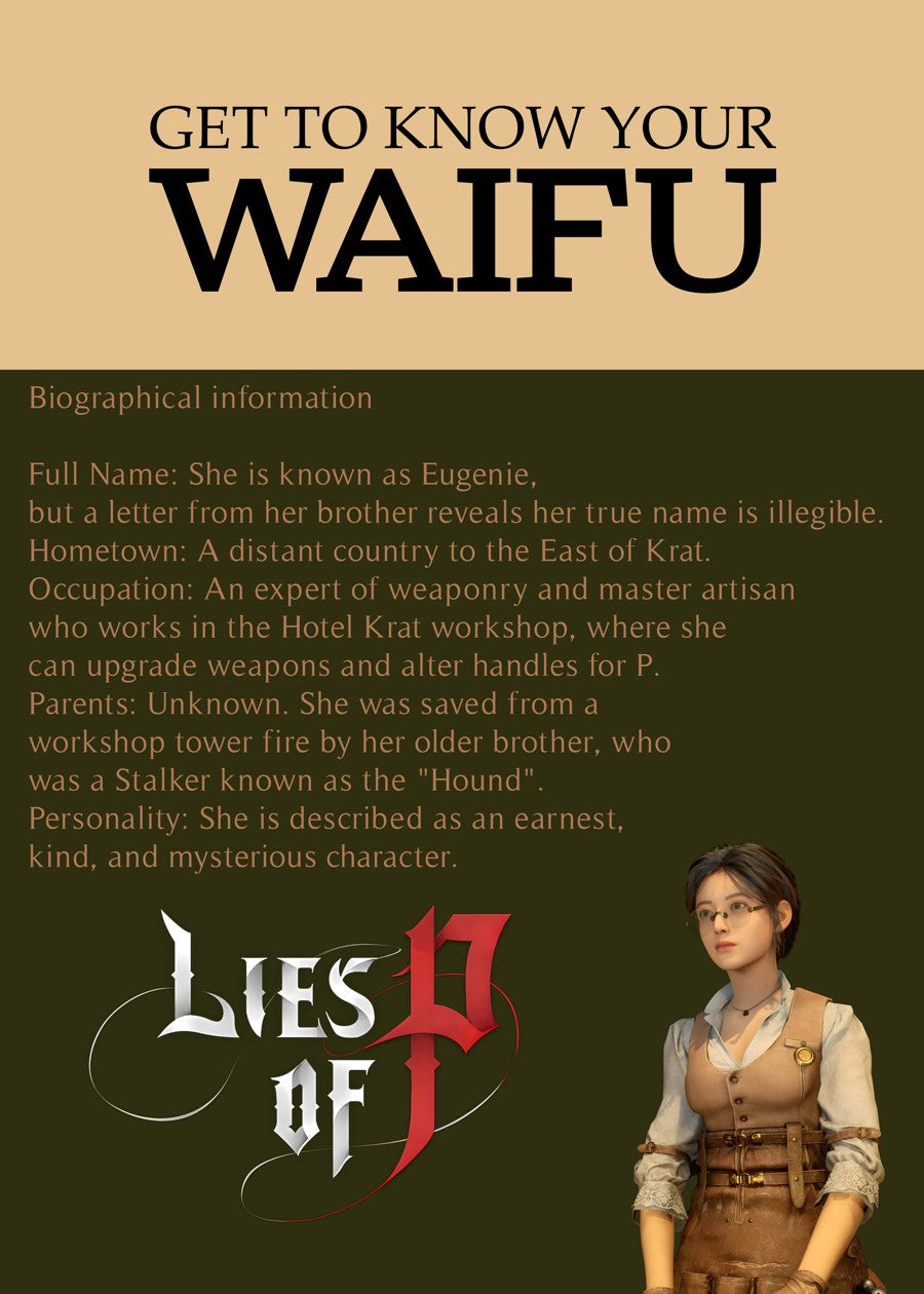 Eugénie is a NPC in Lies of P. Eugénie is an outsider from a distant country to the East of Krat. She is also an expert of weaponry. Interacting with merchants helps the player gain Items by trading or requesting certain services for character or equipment progression. The merchants in Lies of P are found stationed in various spots of the many locations featured in the game.