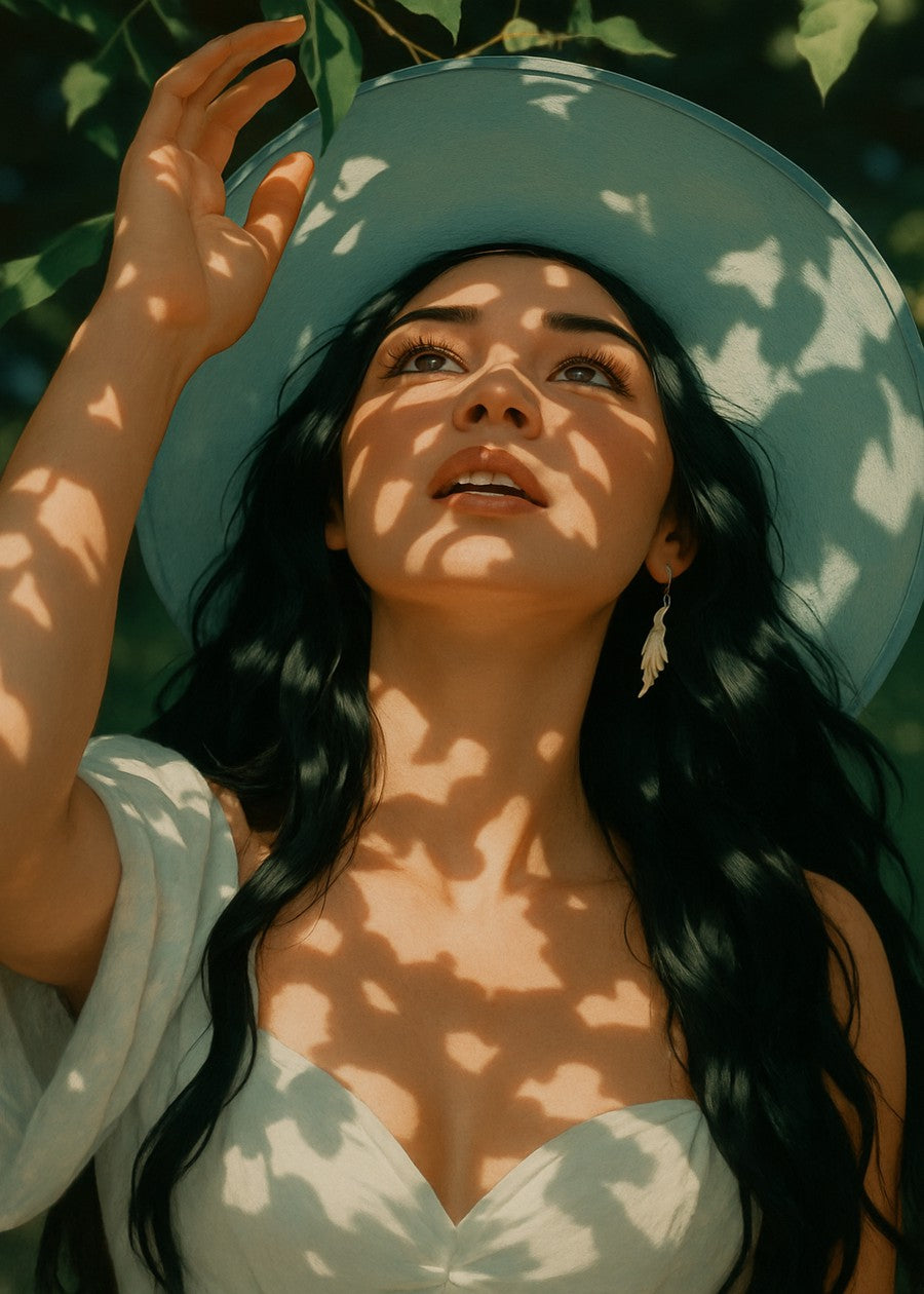 A soft and dreamy portrait of a woman under dappled sunlight. / Luz natural filtrada entre hojas, belleza serena.