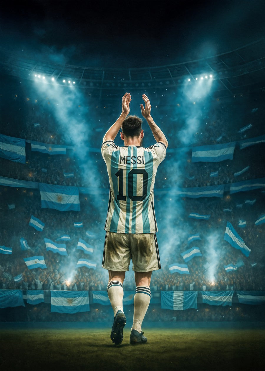 Messi under the stadium lights – a celebration of world cup triumphs, Argentina pride, and legendary finesse. With echoes of Maradona.