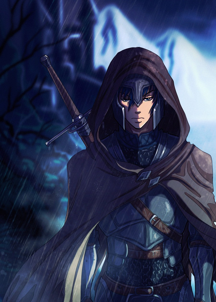 A lone warrior in dark armor and a hood stands in the rain. Lightning flashes in the gloomy sky, illuminating his serious face.