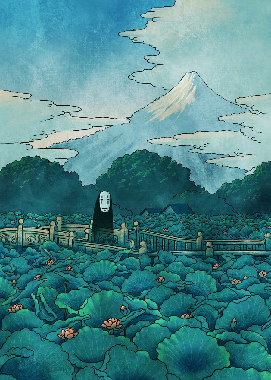 A beautiful and relaxing fantasy scene, the Kaonashi surrounded by a dreamlike lotus flowers field.