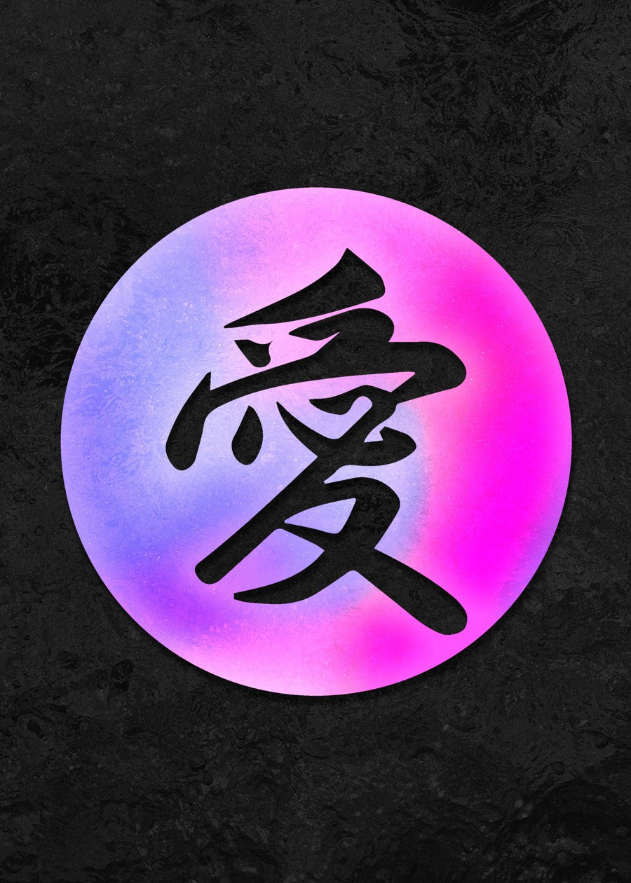 Bold black calligraphy character, meaning "Love," centered on a vibrant circular gradient of blue, purple, and pink.