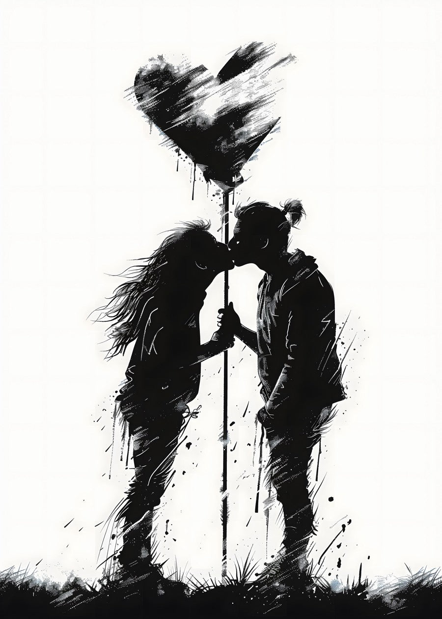 A silhouette couple kisses under a painted heart in monochrome.