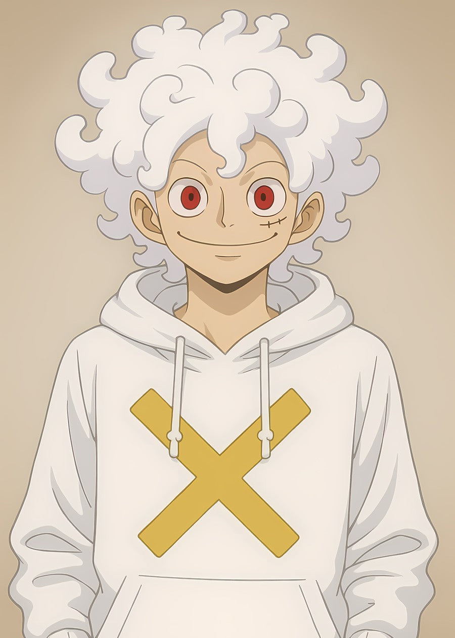 Iconic Gear 5 Luffy in his awakened form — glowing red eyes, white curls, and golden X hoodie symbolizing freedom and divine energy.