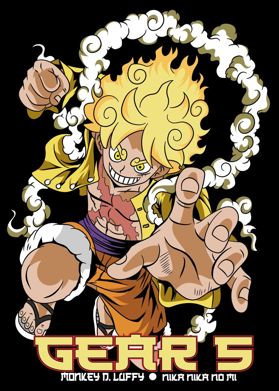 Luffy leaps in vibrant Gear 5 Nika form – bold anime metal poster for true One Piece fans and action art lovers!