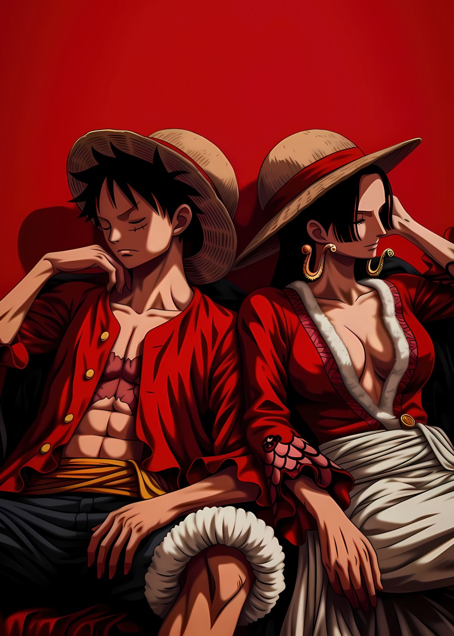 Luffy sits alongside Boa Hancock in a calm moment, highlighting their bond in the One Piece universe
