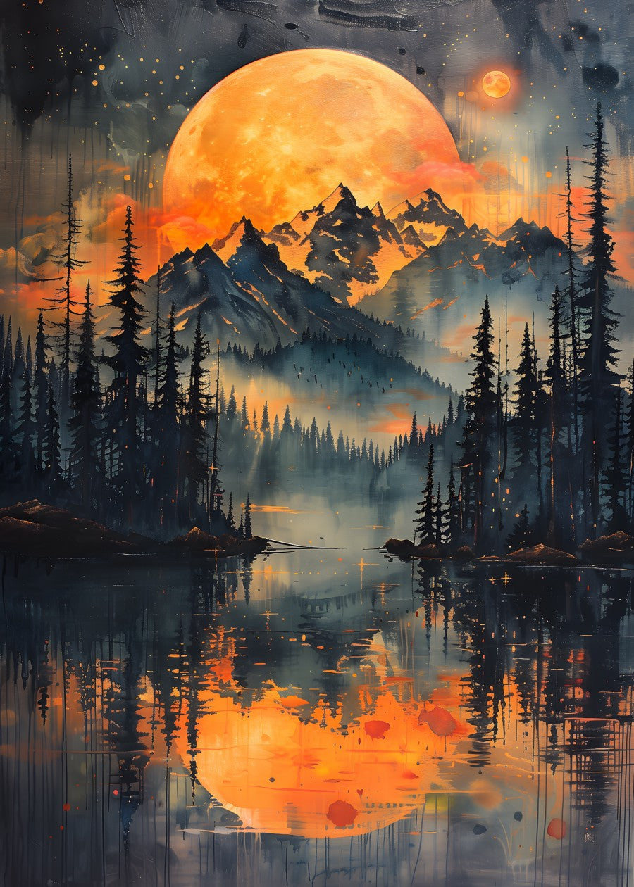 A surreal landscape with a giant moon illuminating misty mountains and a serene lake.