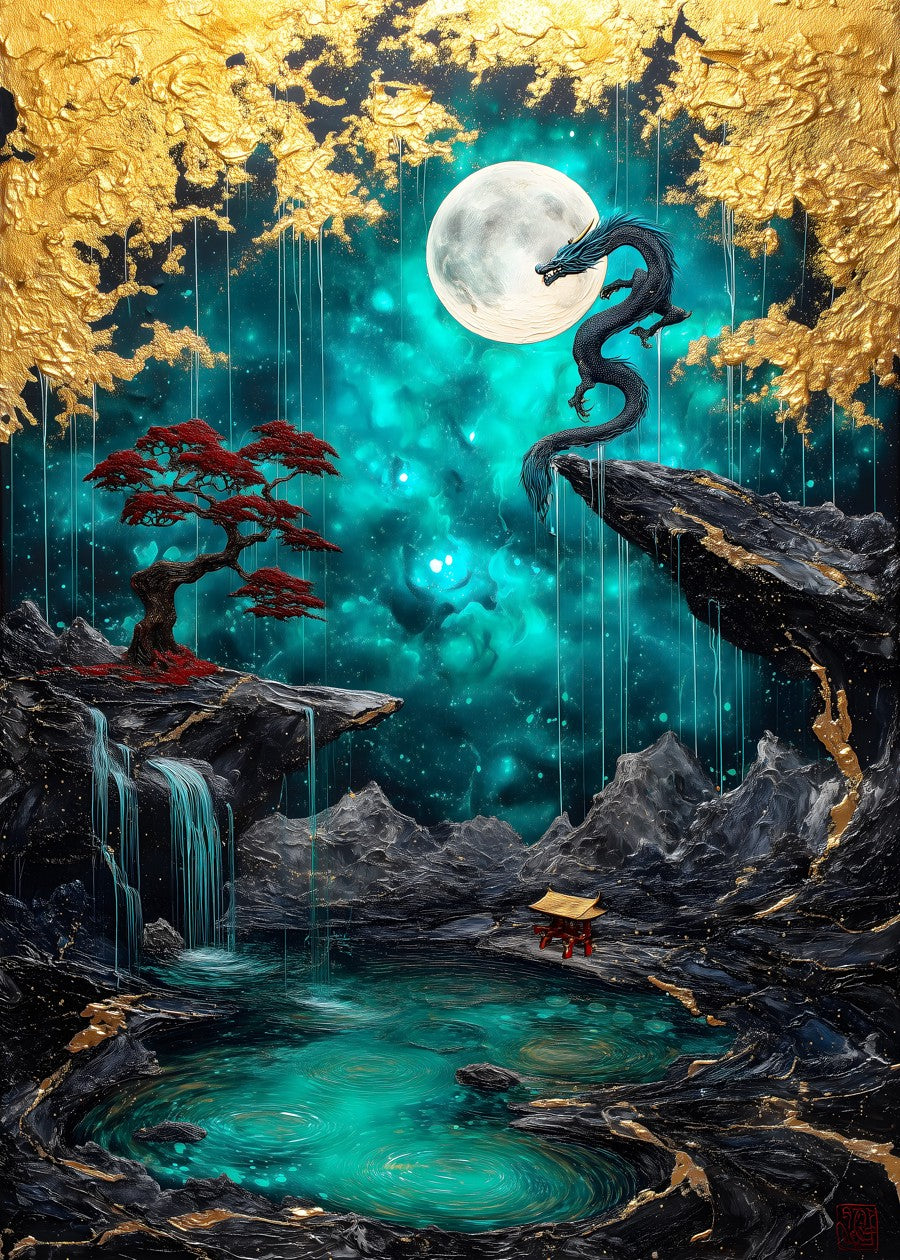 A serene dragon rests under a luminous moon, amidst cascading waterfalls and mystical landscapes.