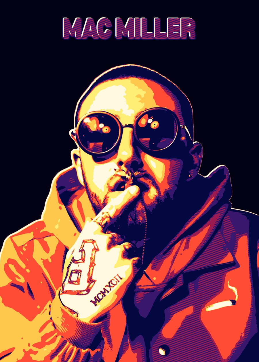 A portrait of legendary rapper Mac Miller with a retro art style and distinctive visual colors.