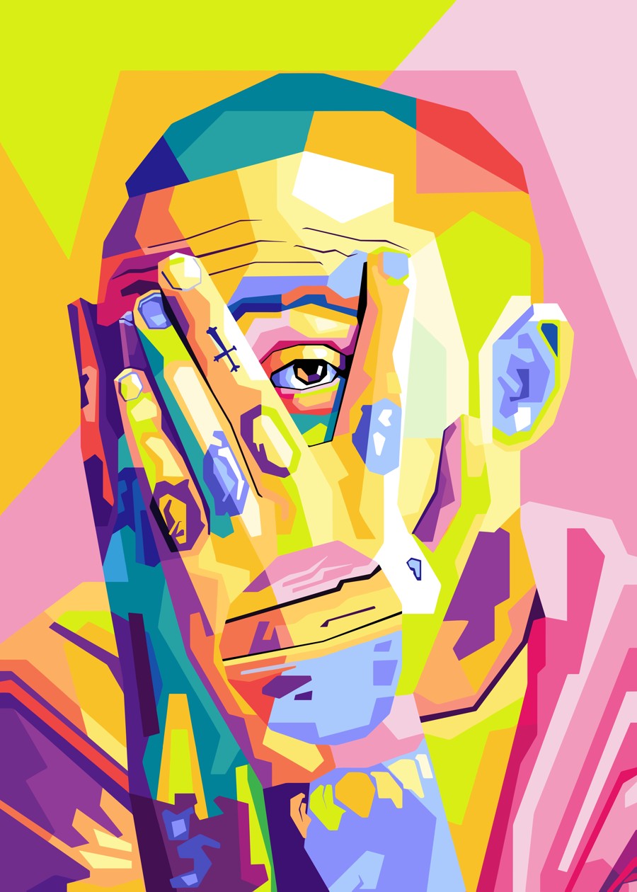 Featuring Mac Miller partly concealed by a hand, this WPAP illustration captures introspection and curiosity.