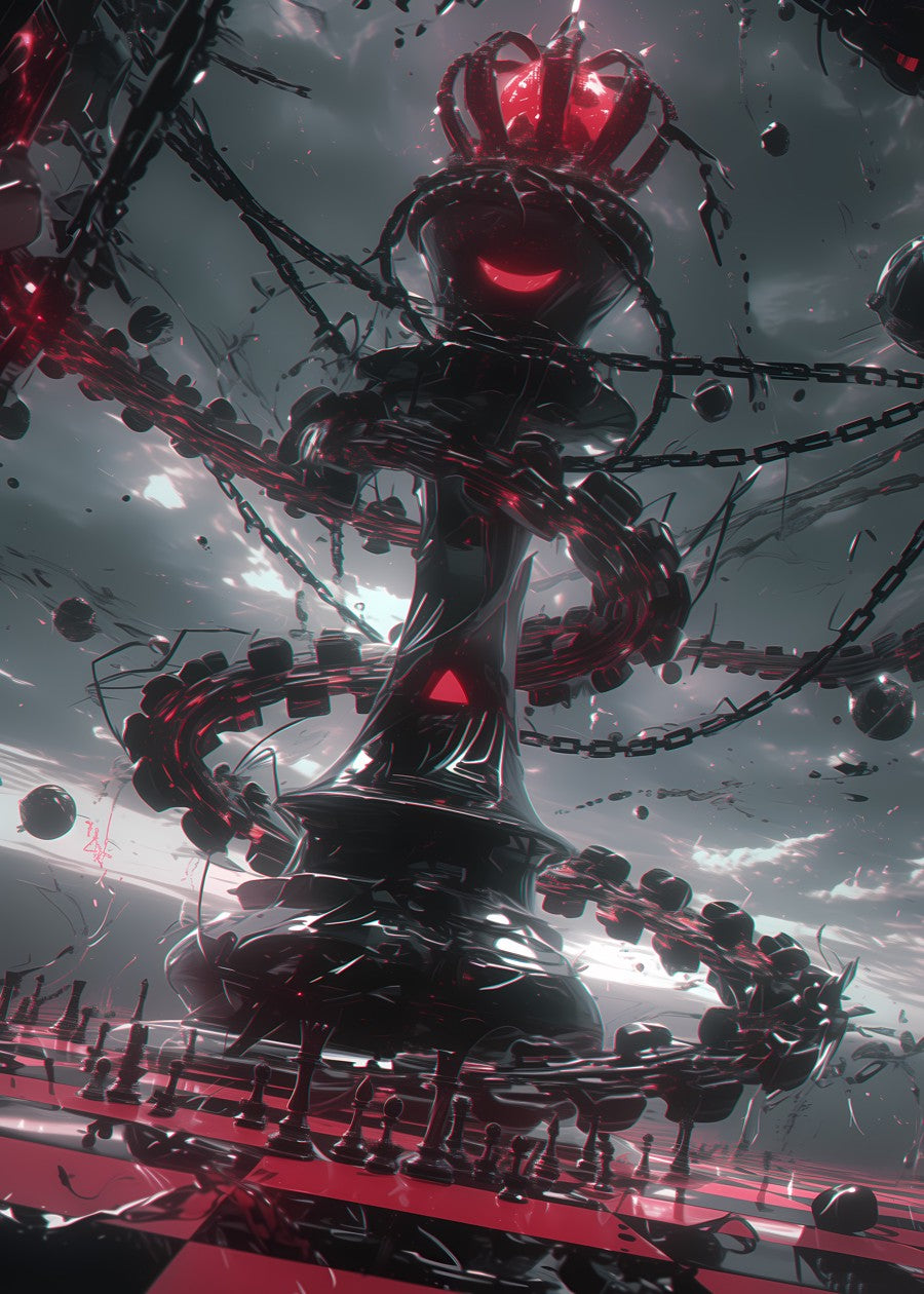 A towering chess king emerges, entwined in chains under a stormy sky.