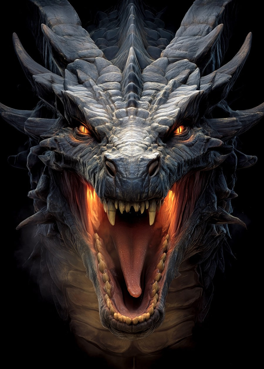 Majestic Dragon Roaring Fiercely Under a Dark Sky, Showcasing Its Formidable Power and Ancient Strength