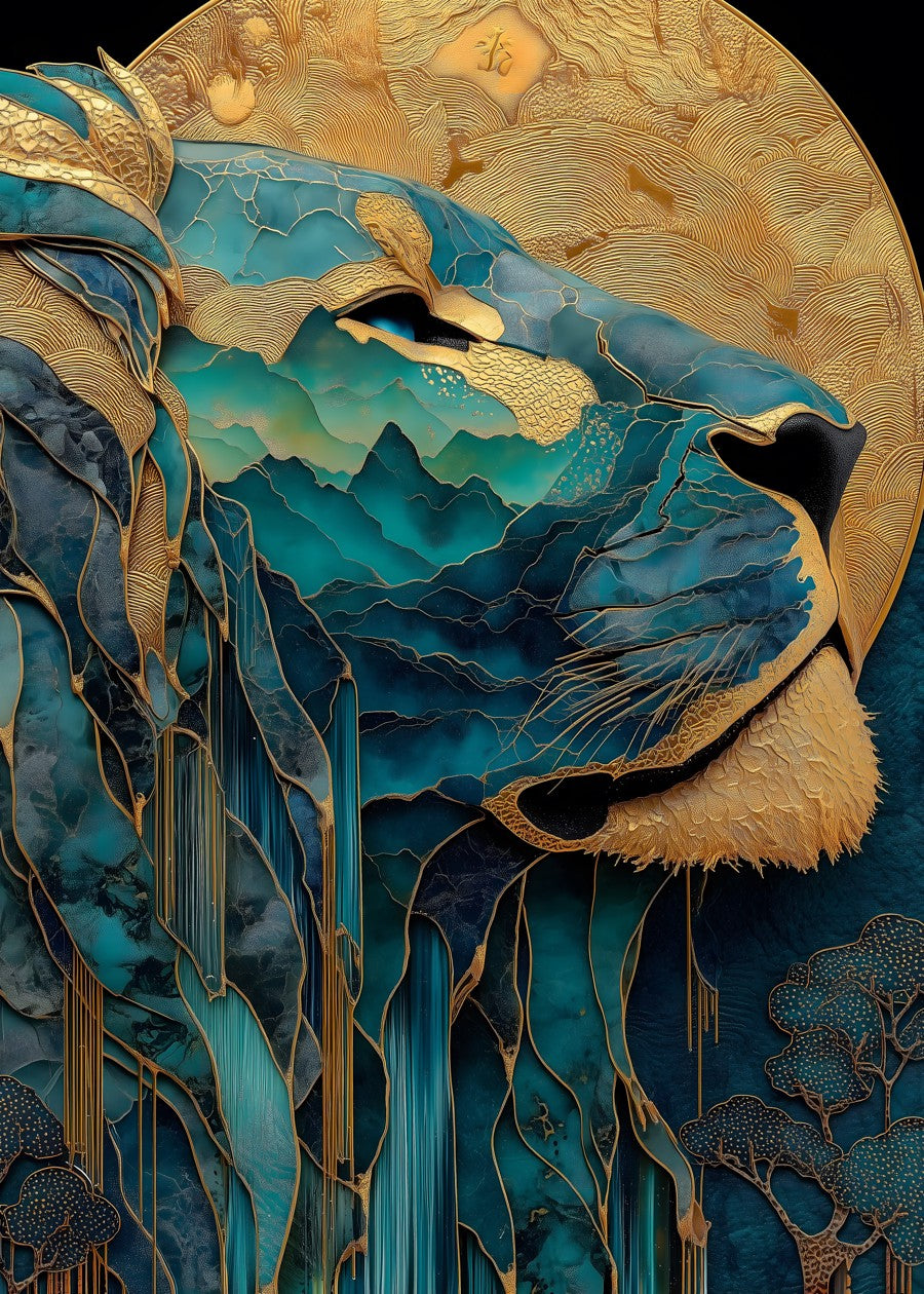 A lion's profile beautifully intertwines with cascading turquoise waterfalls.