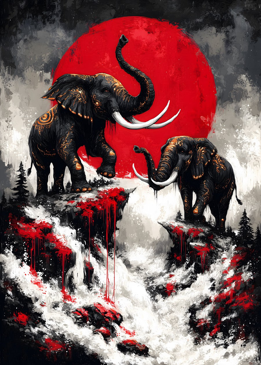 Elephants atop rugged cliffs against a bold red sun, embodying power and tranquility.