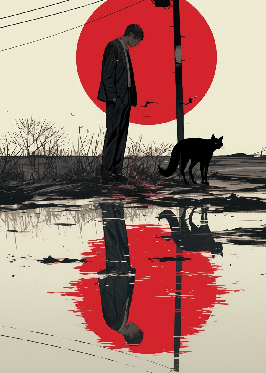 The image features a man in a suit standing near a puddle, with a black cat standing nearby.