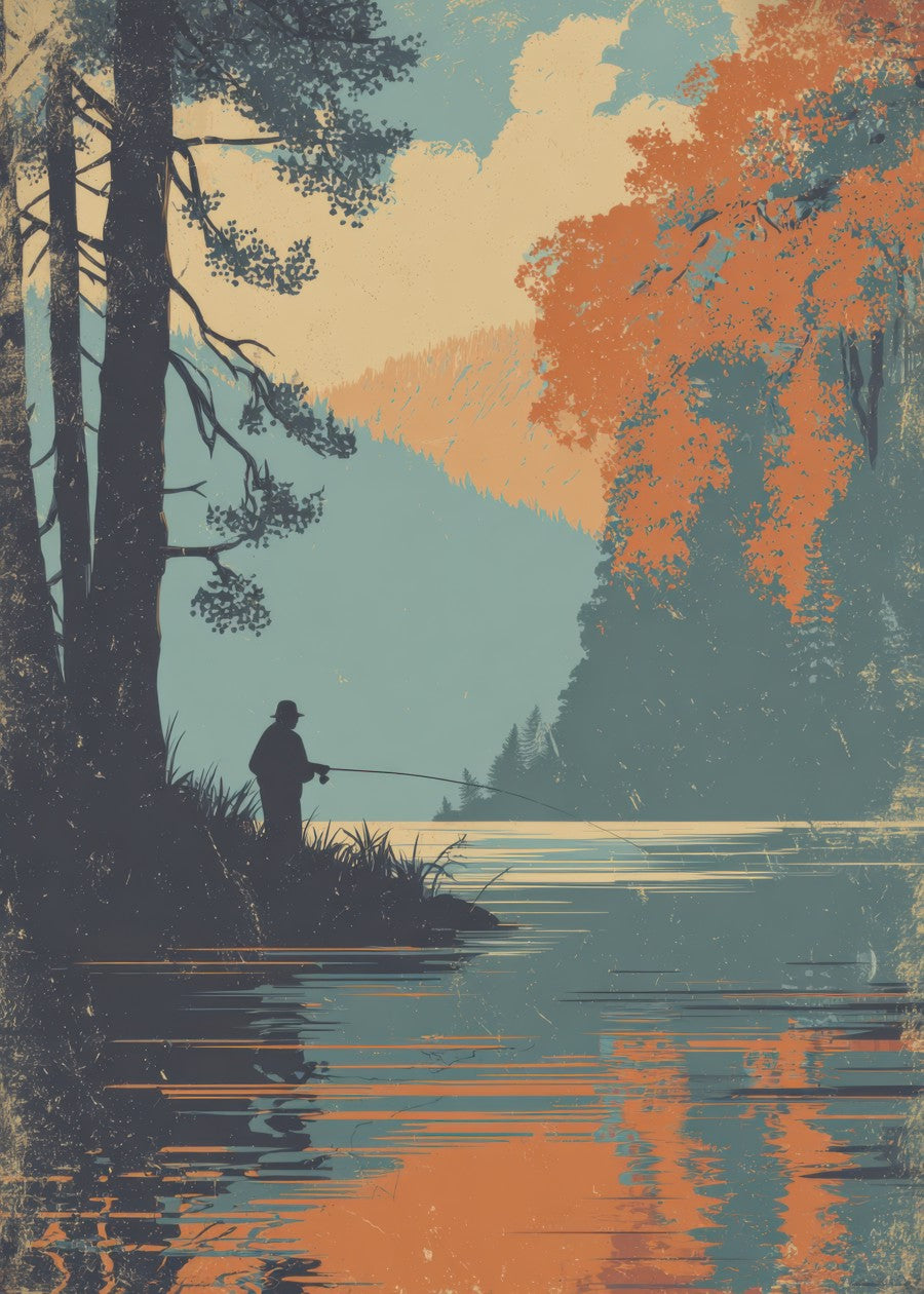 An old man fishing in the lake, with autumn trees and sky reflecting.