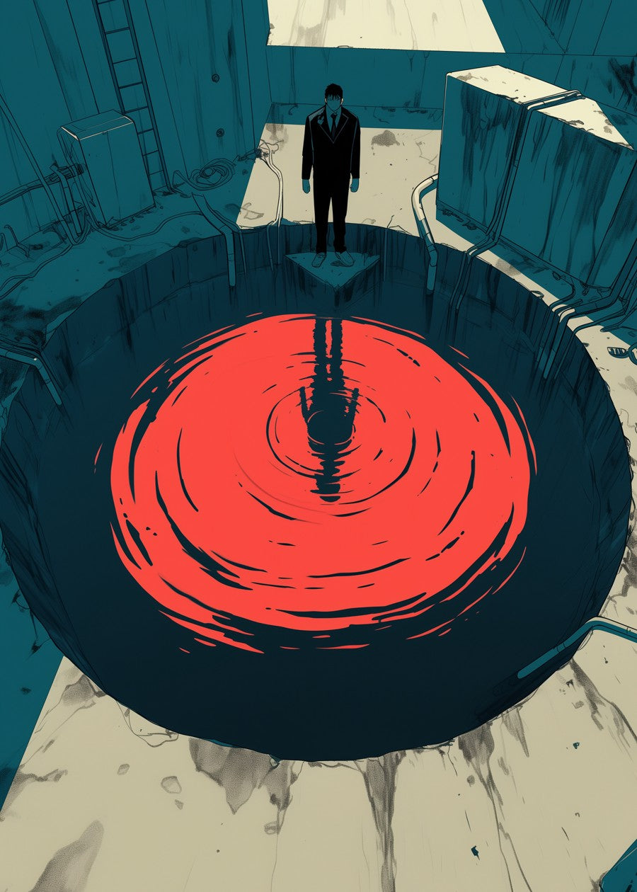 A digital art piece depicts a man in a black suit standing on a small platform above a large, circular vortex of red.