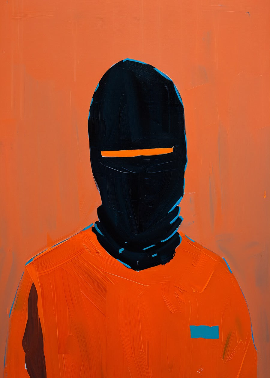 A faceless figure in orange and black—mysterious, abstract, and confrontational.