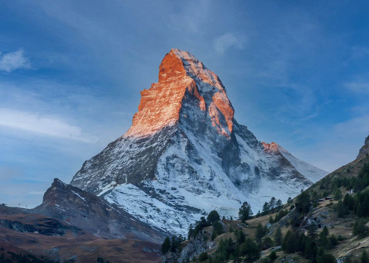 The Matterhorn is a mountain of the Alps, straddling the main watershed and border between Switzerland and Italy. It is a large, near-symmetric pyramidal peak in the extended Monte Rosa area of the Pennine Alps, whose summit is 4,478 metres above sea level, making it one of the highest summits in the Alps and Europe.