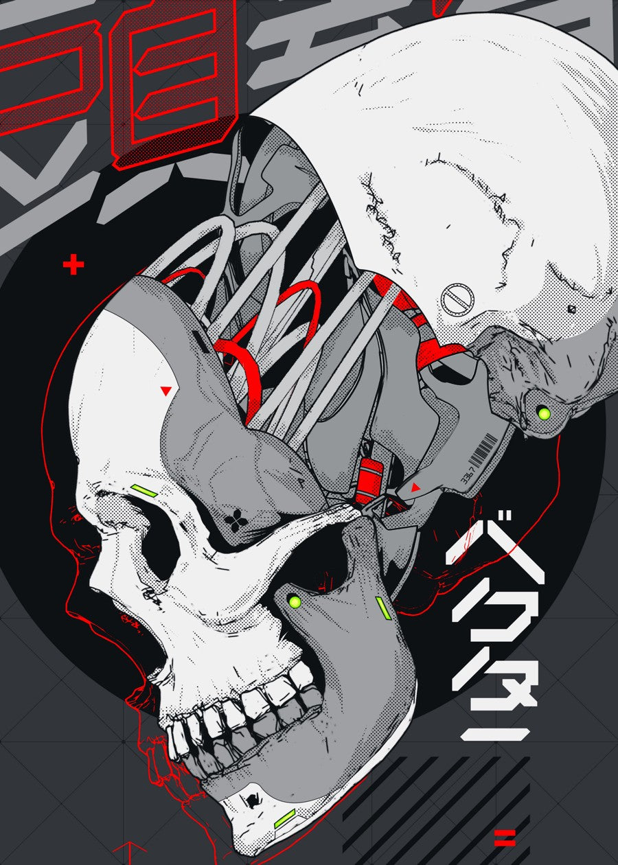 A detailed, monochromatic, and red illustration of a partially dismantled human skull with visible internal cybernetic and mechanical augmentation.