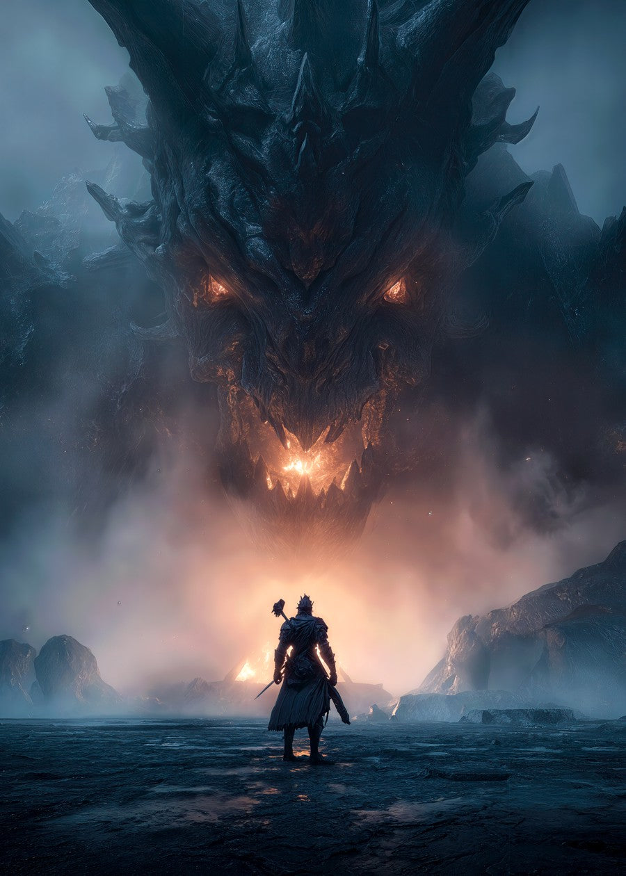 Warrior Faces a Massive Dragon in a Mystical Landscape Beneath a Stormy Sky at Dusk
