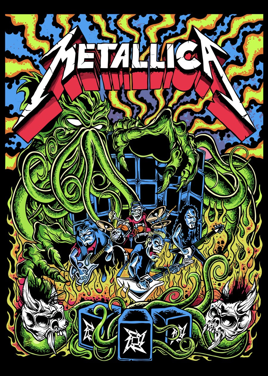 This digital art features the band Metallica in a dynamic and surreal composition. The band members are depicted playing their instruments a