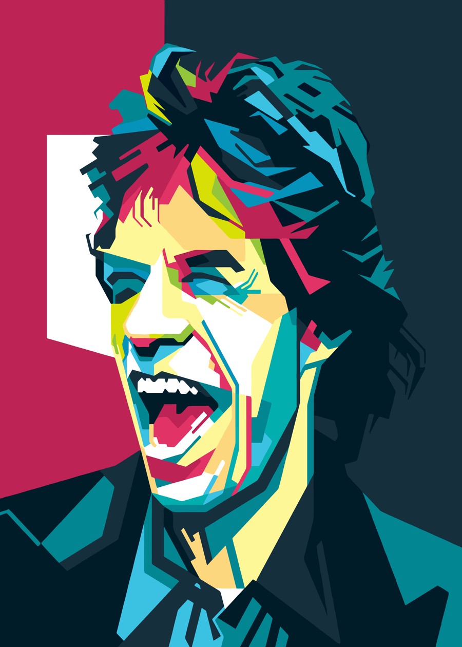 This stylized portrait of Mick Jagger uses bright blocks of color and abstract lines.