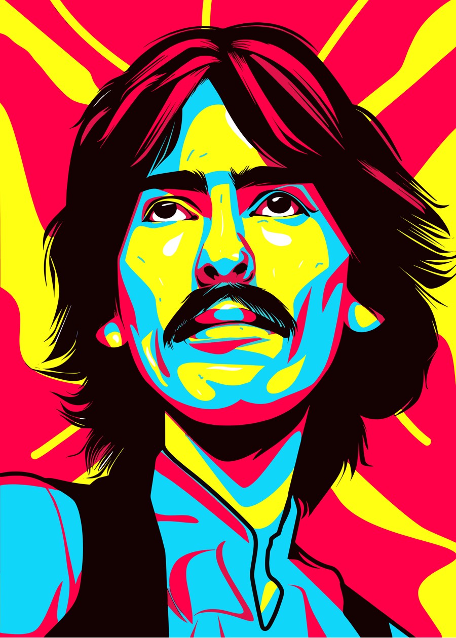 Bold lines and electrifying colors paint a pop-art portrait of a rock star with long flowing hair and a suit against a striking red and yellow background.