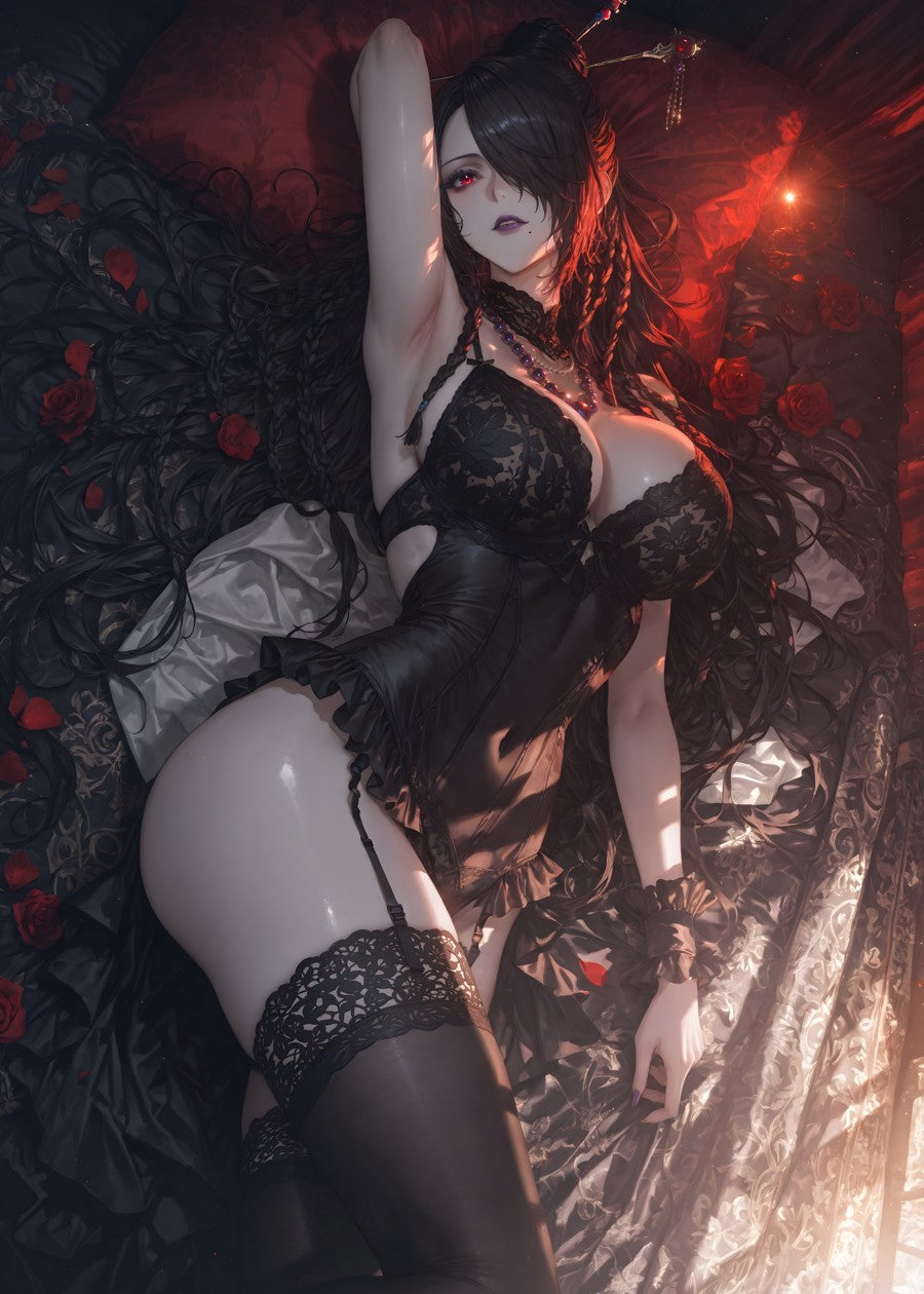 Mysterious figure in lace, surrounded by roses, capturing the essence of night.