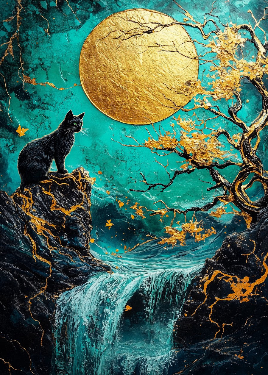 A black cat gazes at the golden moon above a mystical waterfall and twisted tree.