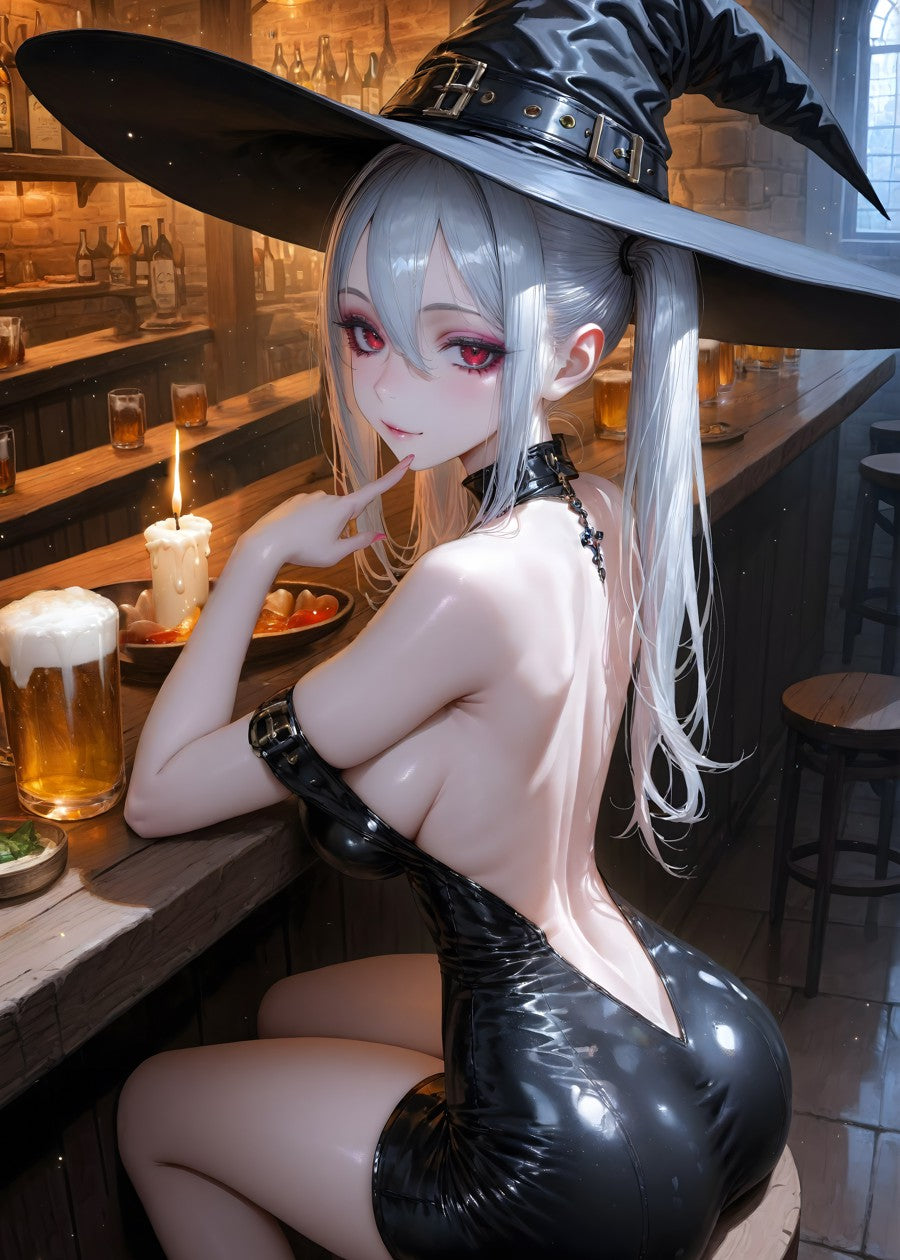 An enchanting witch in a cozy tavern setting, under the mysterious glow of candlelight.
