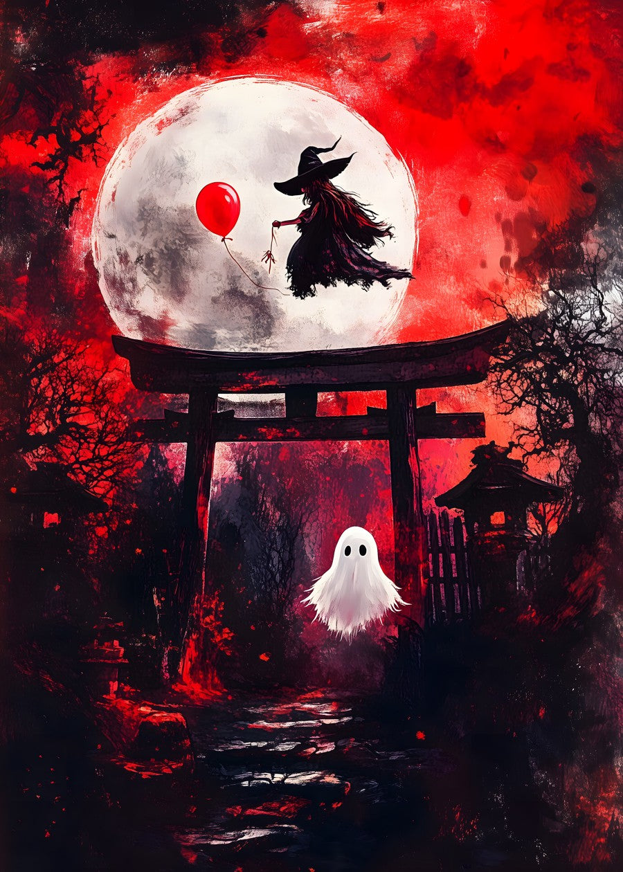 A witch floats under a crimson moon, holding a balloon over a spectral village gate.