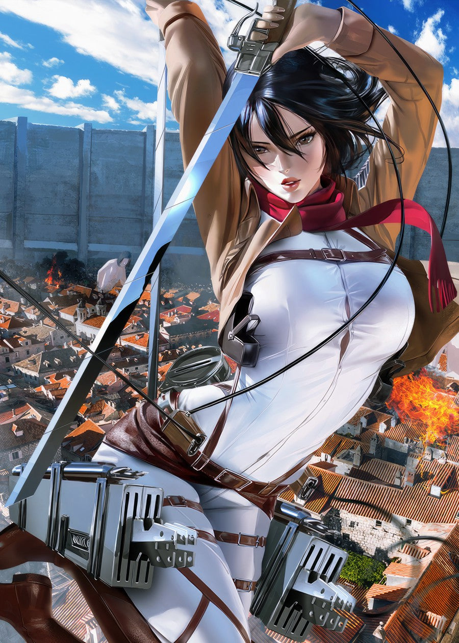 A stoic female soldier with short black hair and a red scarf, standing amidst ruins of war.