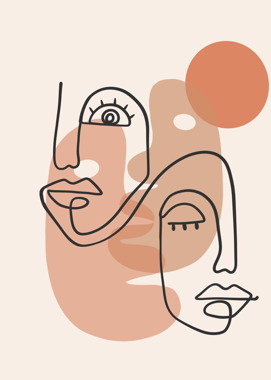Abstract line art of two faces with peach and beige organic shapes in modern minimalist style.