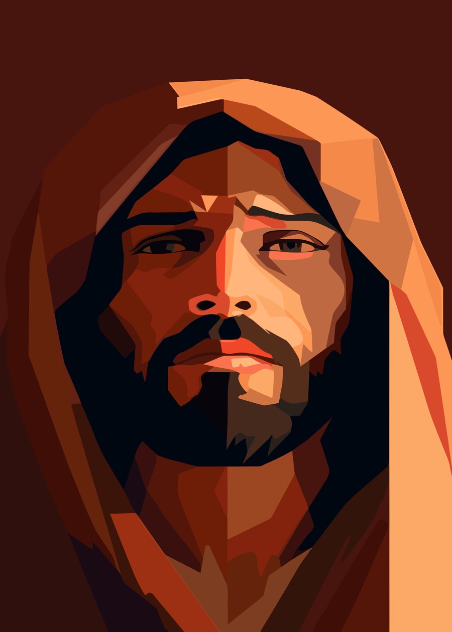 minimalist vector illustration using earthy browns and angular shapes to embody a sacred figure, evoking spiritual depth through simplicity.