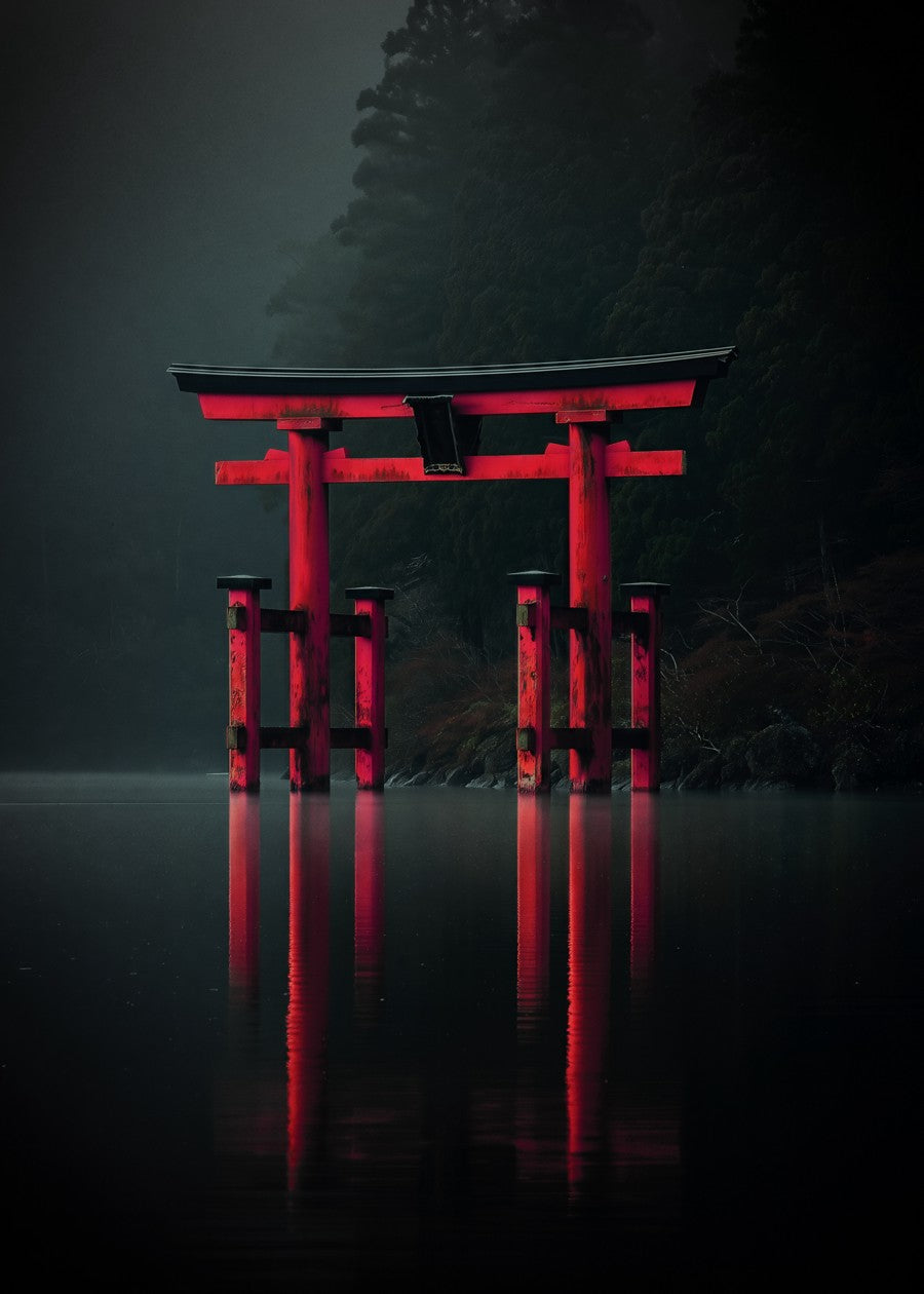 A striking red torii gate stands majestically in calm water, reflecting its vibrant color. Surrounded by a dark, serene forest.