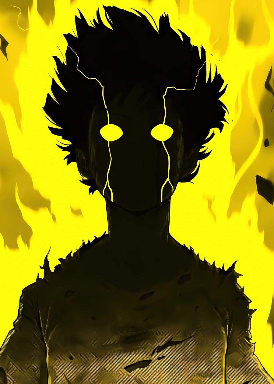 Mob from Mob Psycho 100 surrounded by intense yellow psychic aura with glowing eyes