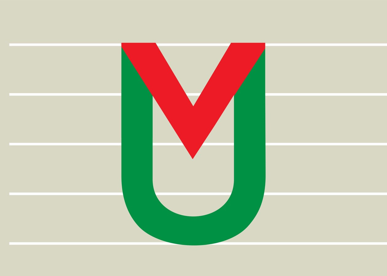 A bold and minimalist artwork featuring abstract letters in red and green.
