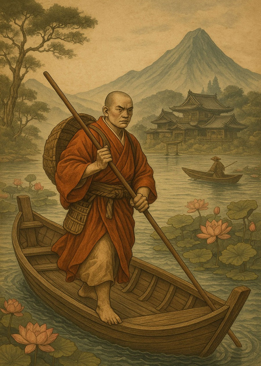 A lone monk drifts gently along a lotus-filled river in 16th century Japan.