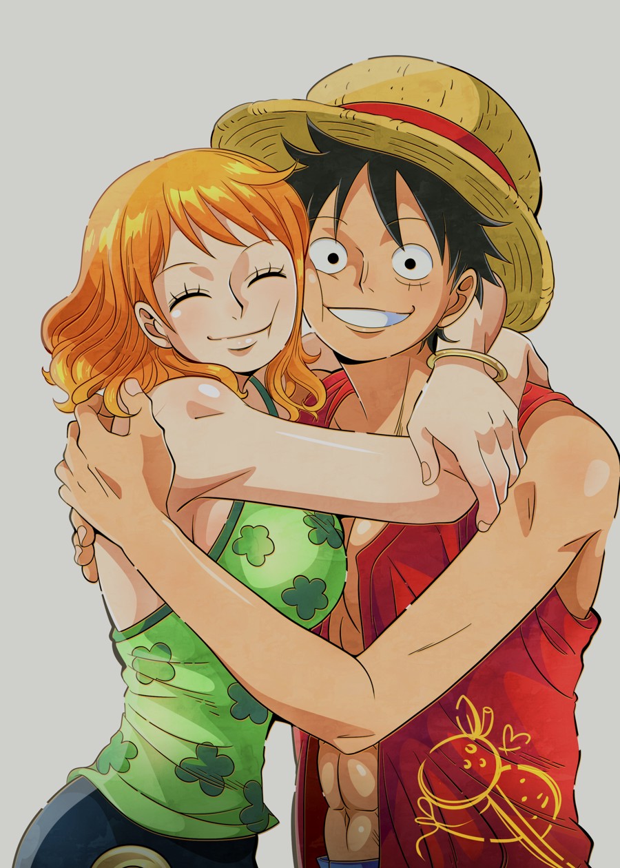 A heartwarming illustration of Monkey D. Luffy and Nami from One Piece sharing a close hug.