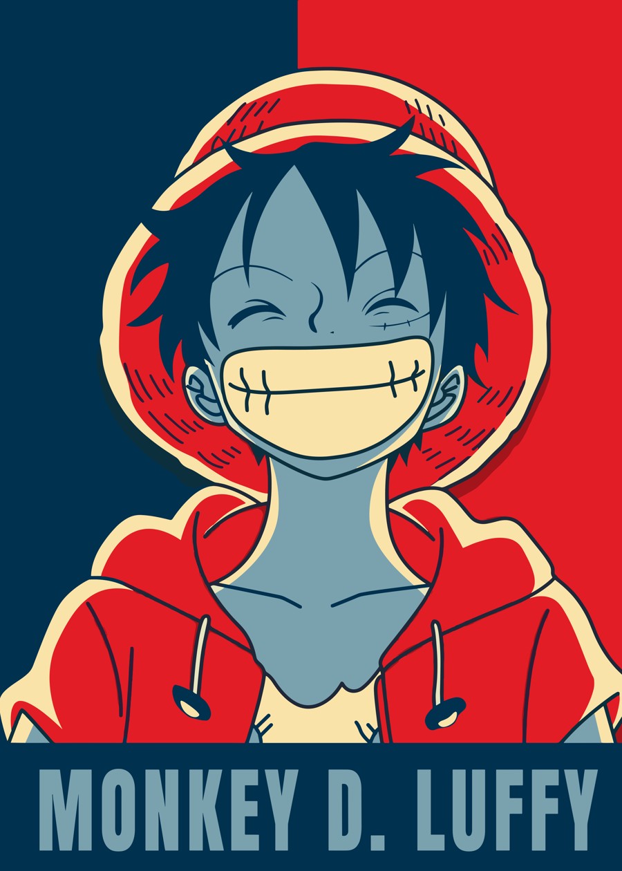 This two-tone vector illustration portrays Monkey D. Luffy from One Piece with his signature wide grin.