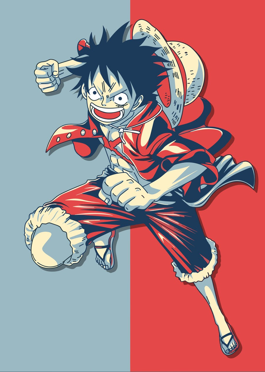 Monkey D. Luffy from "One Piece," split between blue and red backgrounds.