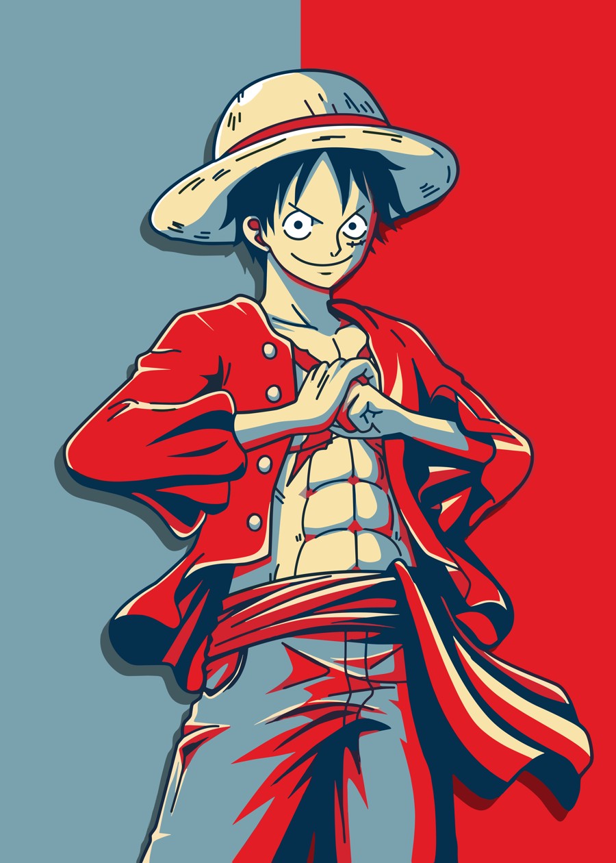 Displaying Monkey D. Luffy in a classic pose, this blue and red two-tone vector artwork uses minimalist lines to capture his iconic look.