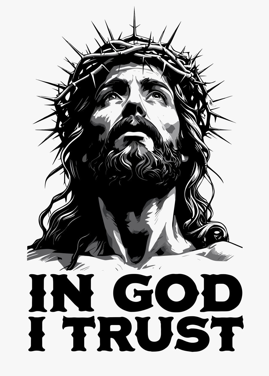 Striking black-and-white illustration of a crowned figure with the words “IN GOD I TRUST,” highlighting faith and strength.