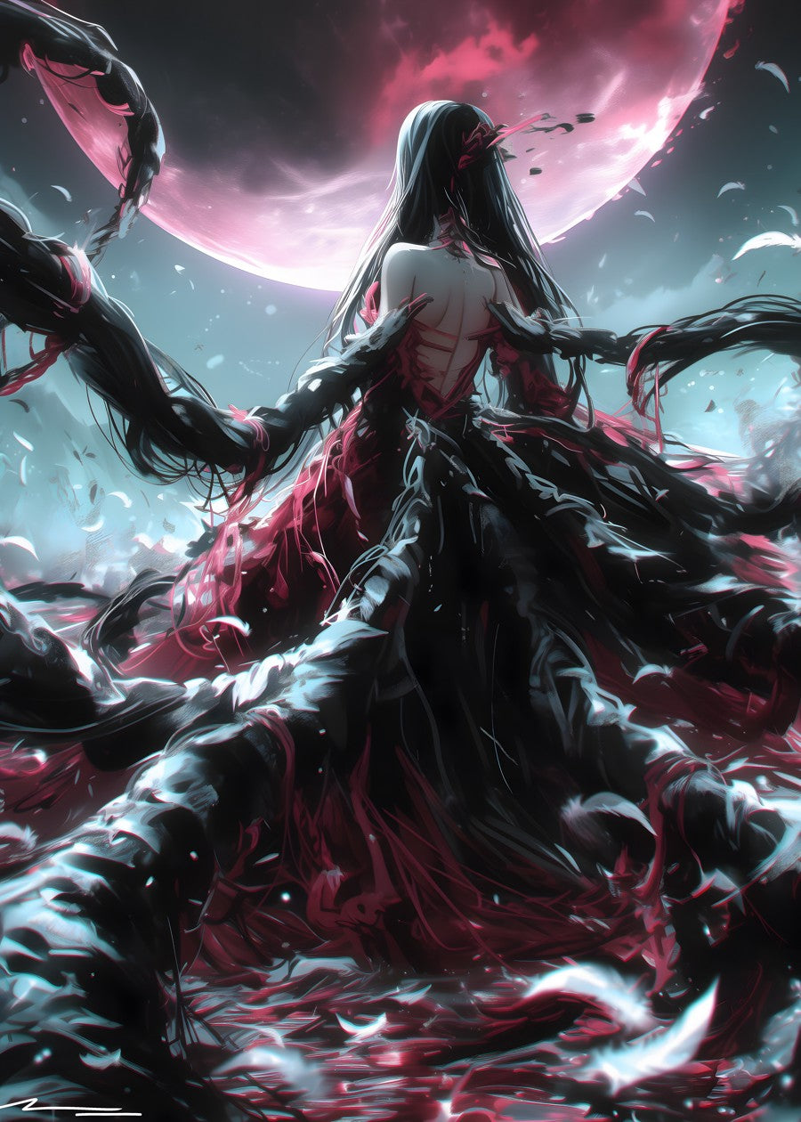 A silhouette stands beneath a glowing moon, enveloped by ethereal strands.