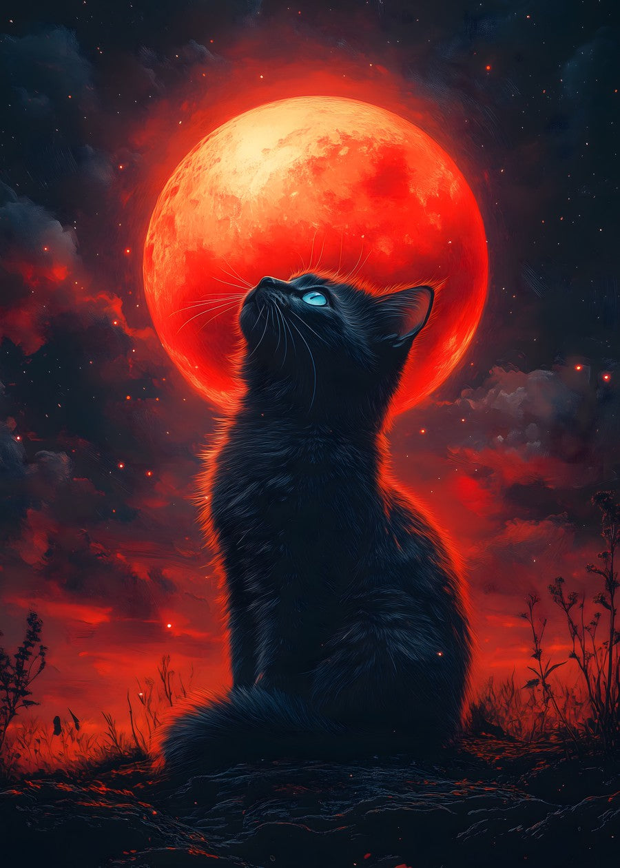 A mystical cat gazes at a glowing red moon amidst the cosmic night sky.