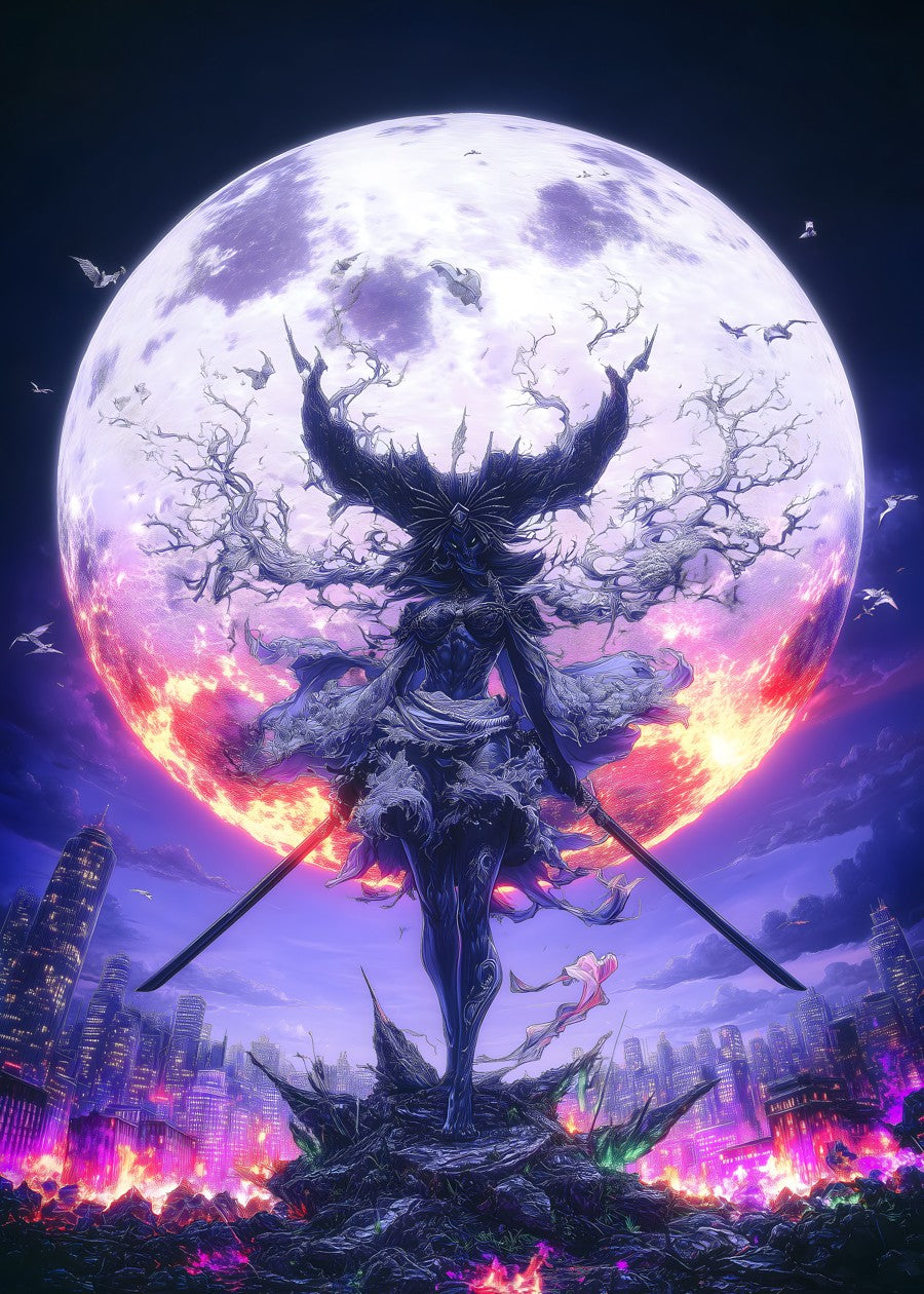 A mystical figure stands against a giant moon, guarding a vibrant cityscape.