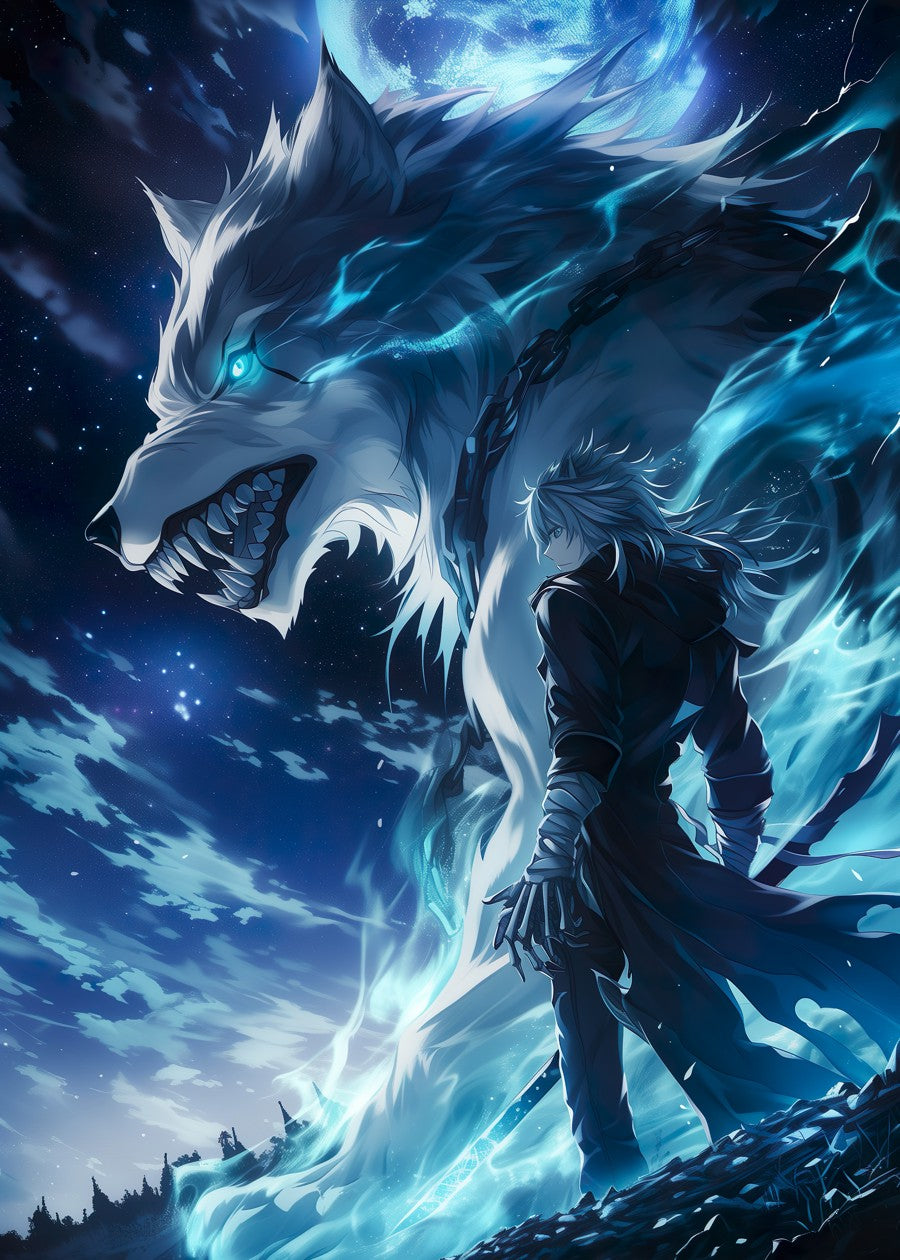 A warrior and mythical wolf under a glowing moonlit sky.