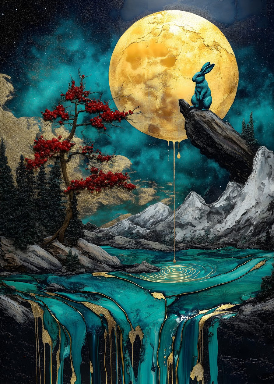 A rabbit gazes at a golden moon from atop a mystical rock.
